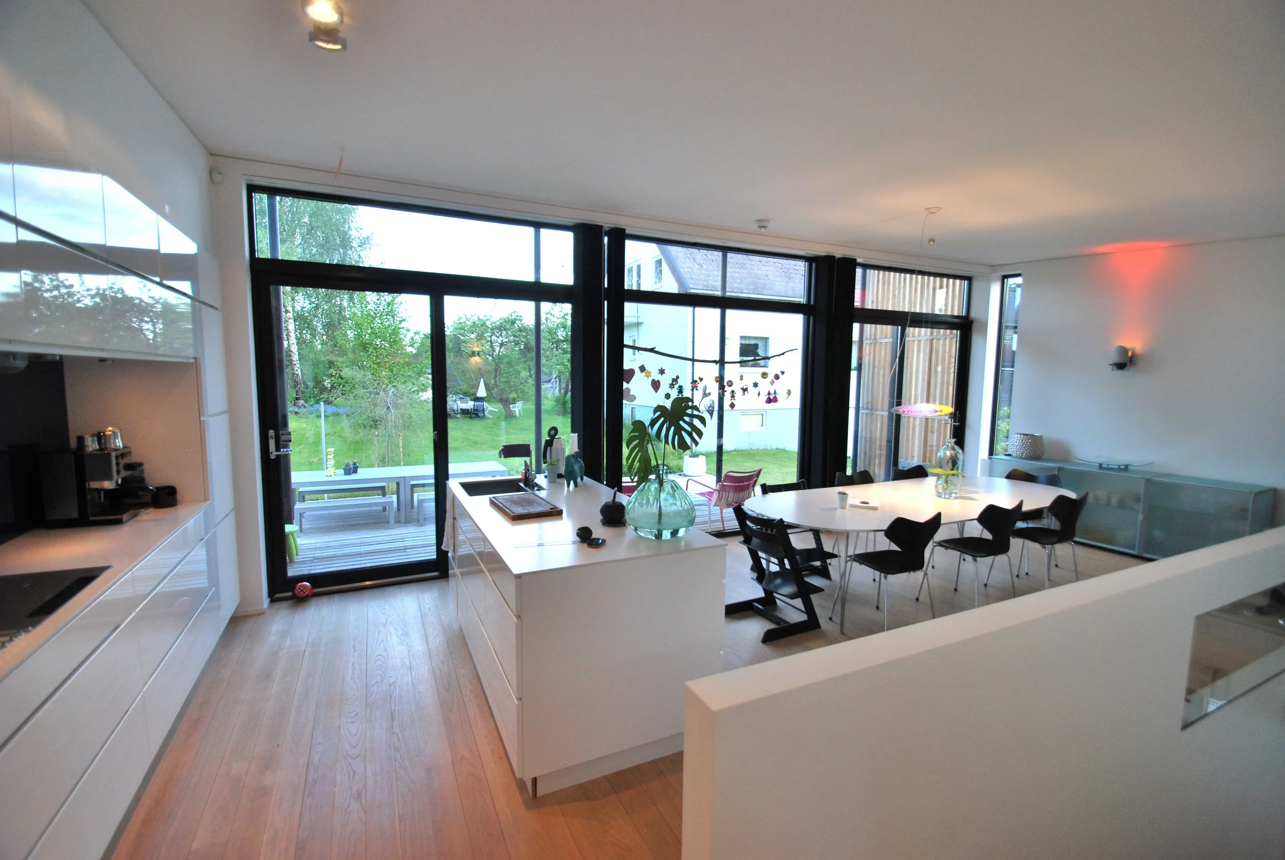 og en hovedetasje kledt i sibirsk lerk. Hele hovedetasjen er et åpent kjøkken/stue-areal, kun delt av med trappen i midten og med store skyvedører.