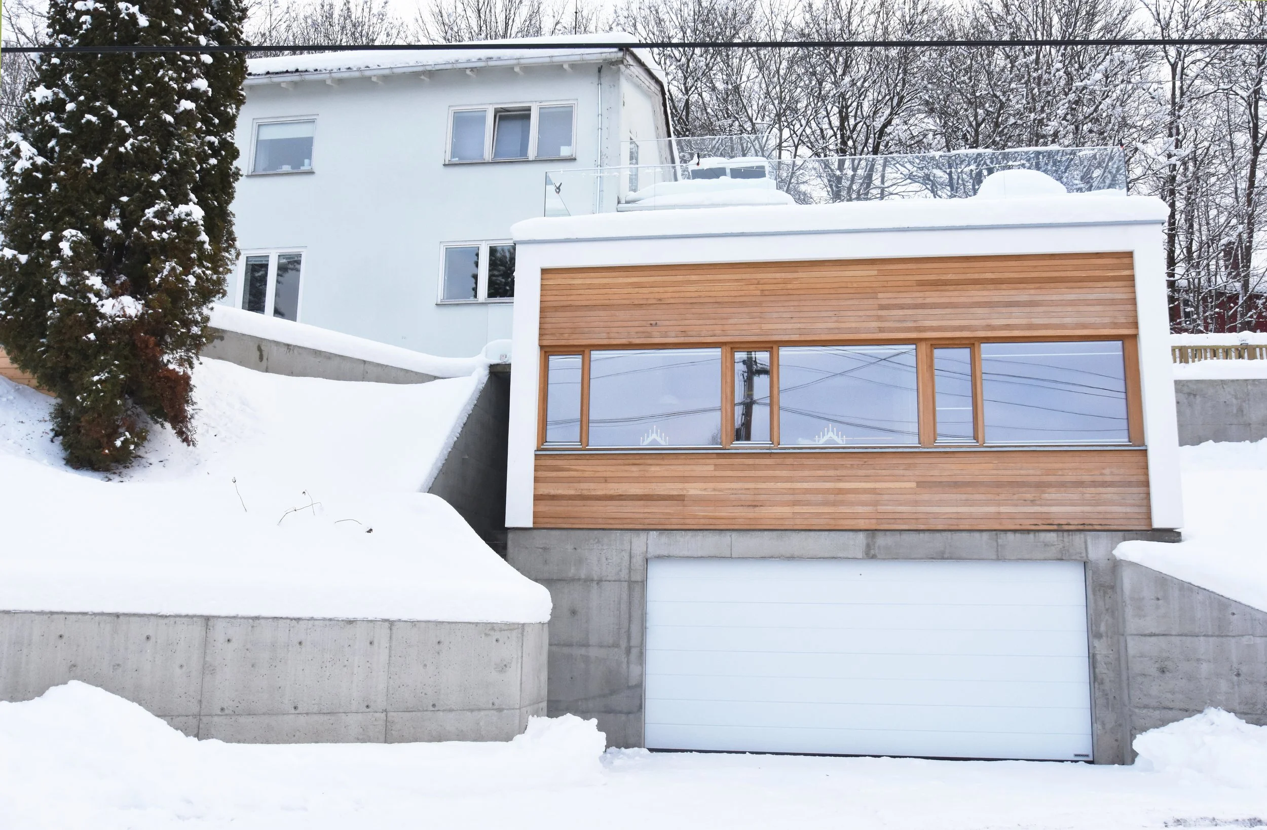 Støttemurer og sokkel rundt garasje er i ubehandlet plateforskalet betong. Fronten av gjestehybelen mot gaten er i oljet eik.