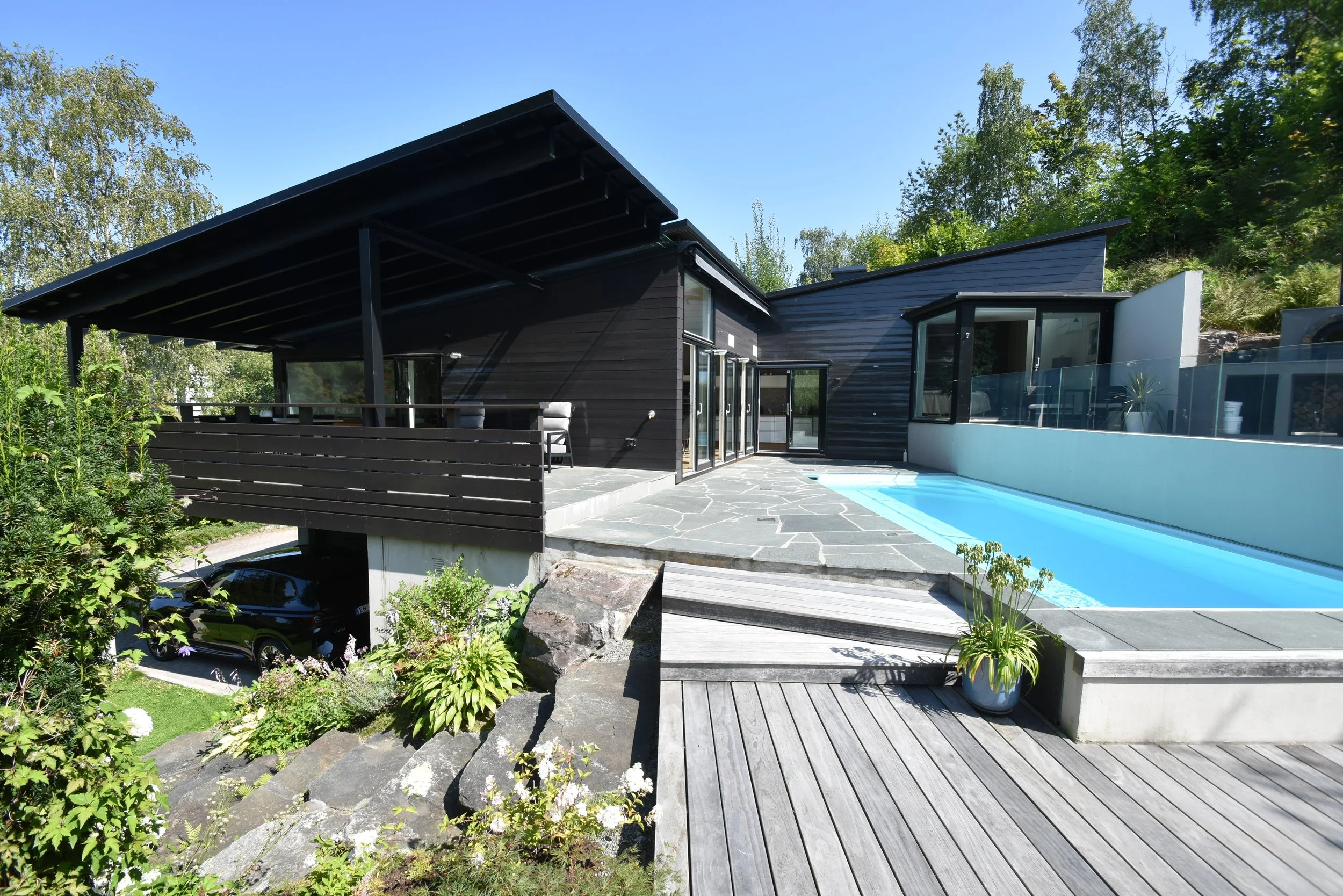 Det eksisterende typehuset fra 60-tallet ble fullt ombygget og utvidet, og fikk omorganisert hage med nytt svømmebasseng
