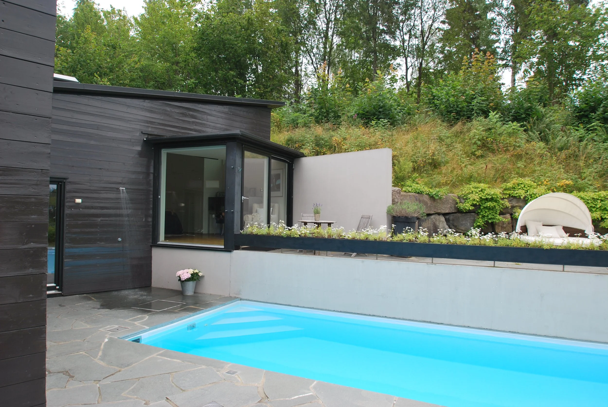 I det sør- og vestvendte åpne atriet i hagen ble det bygget svømmebasseng