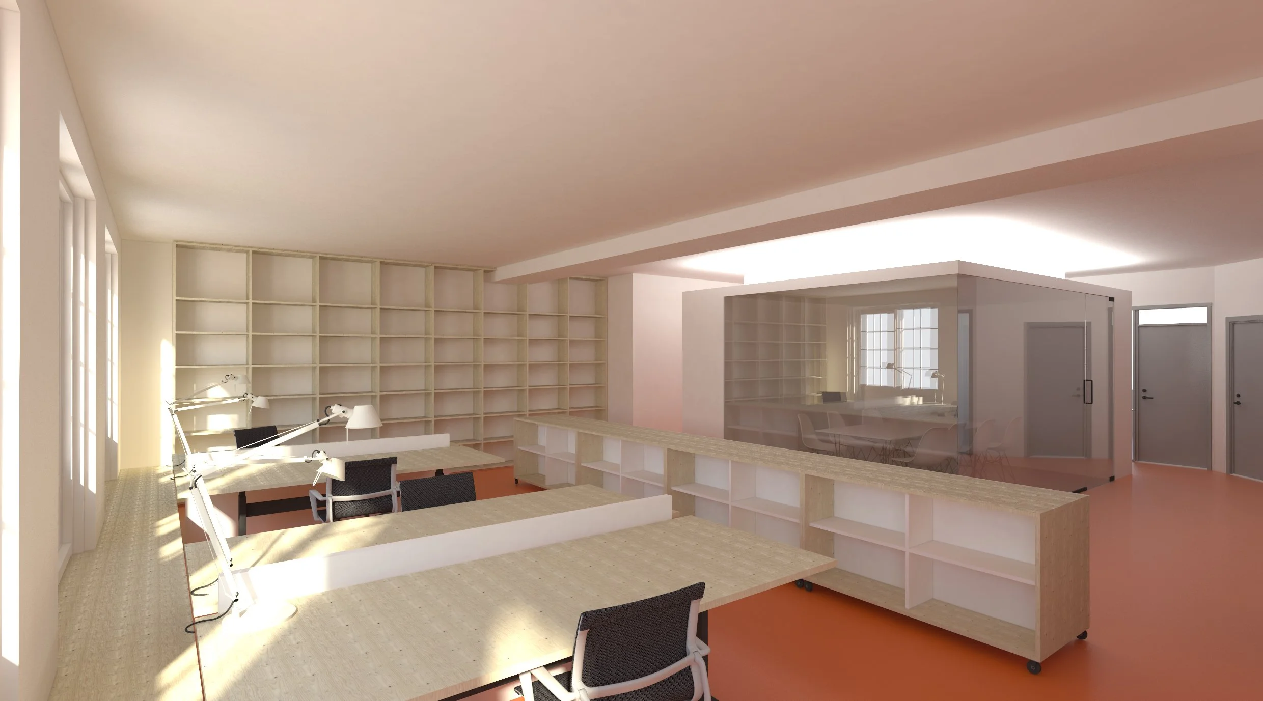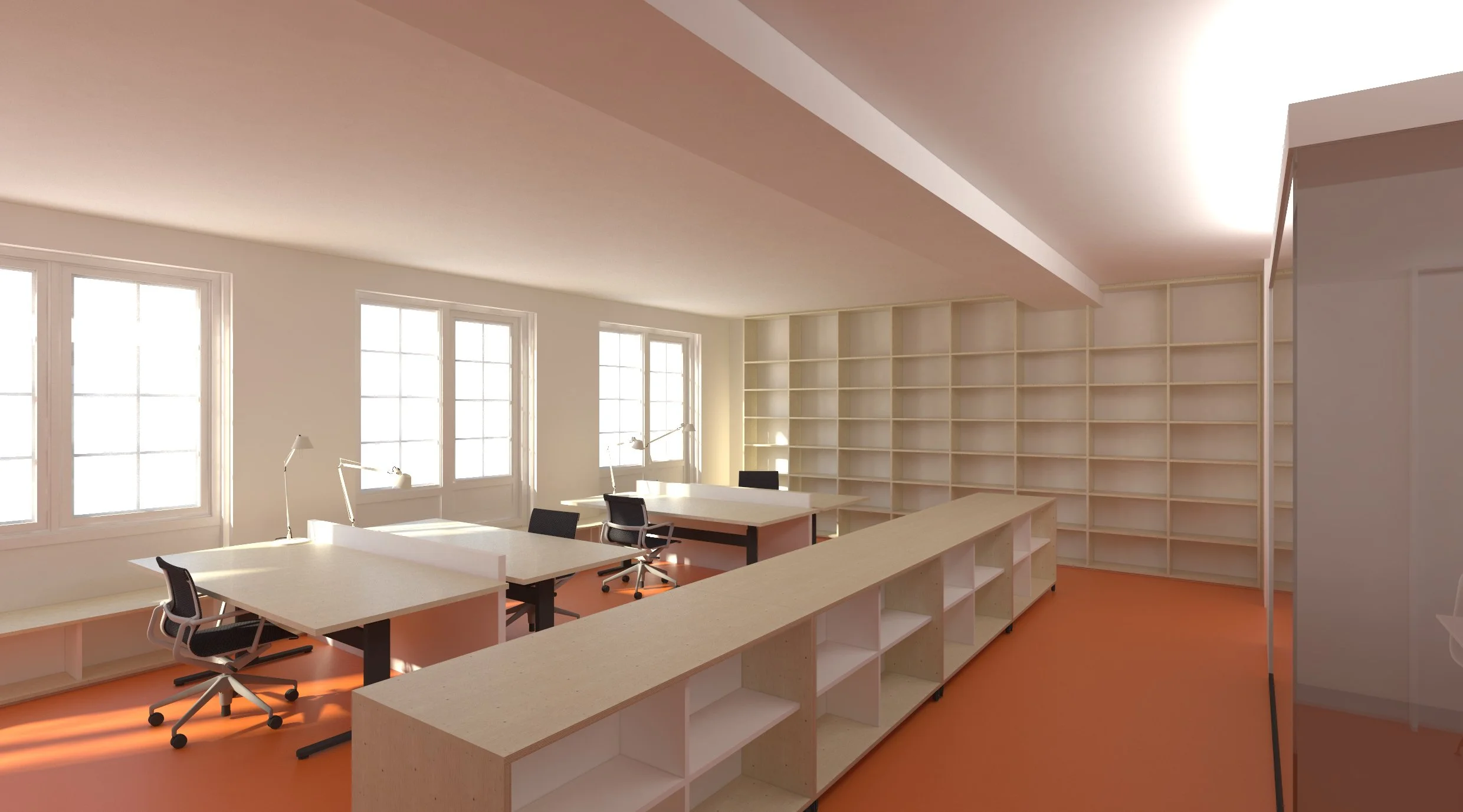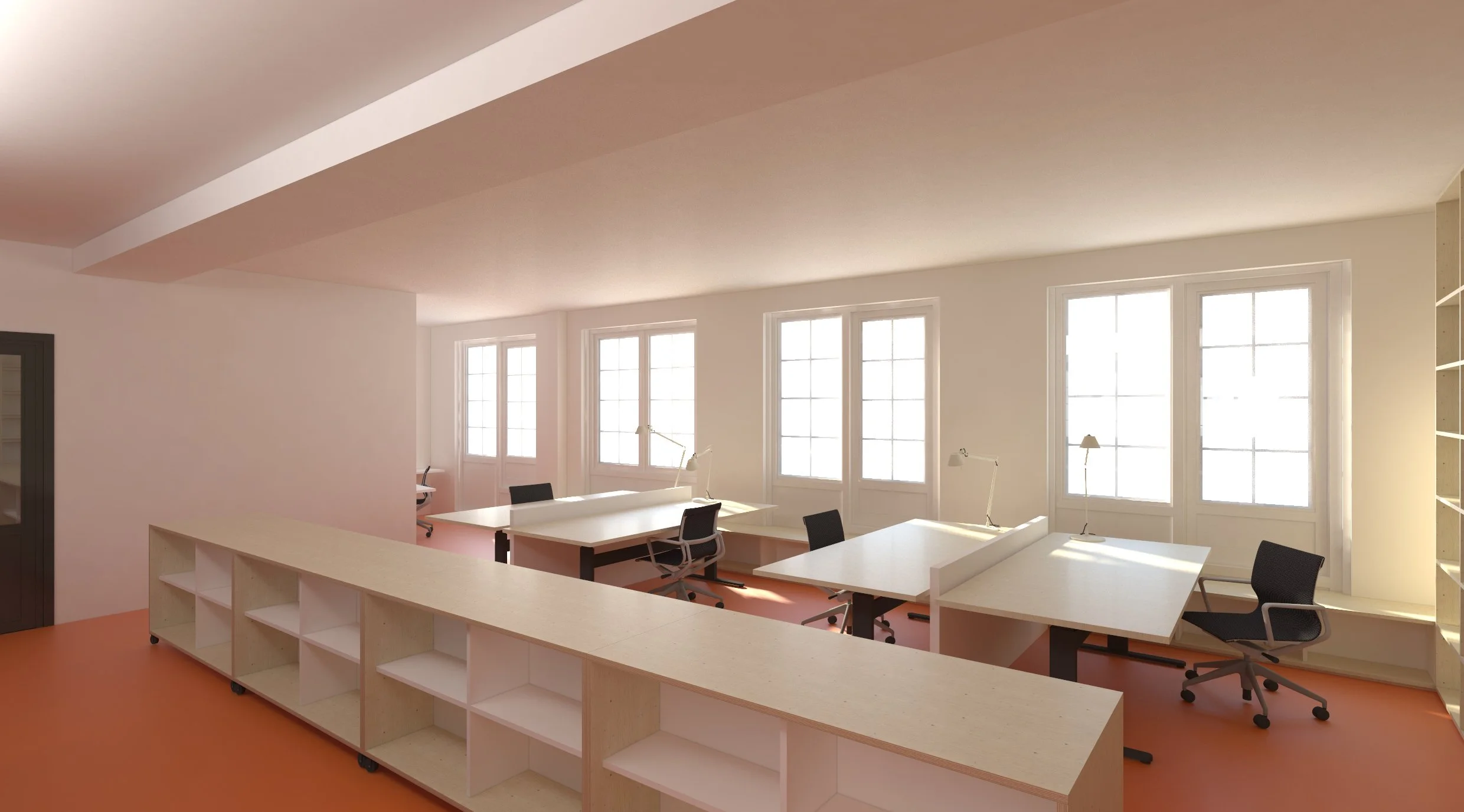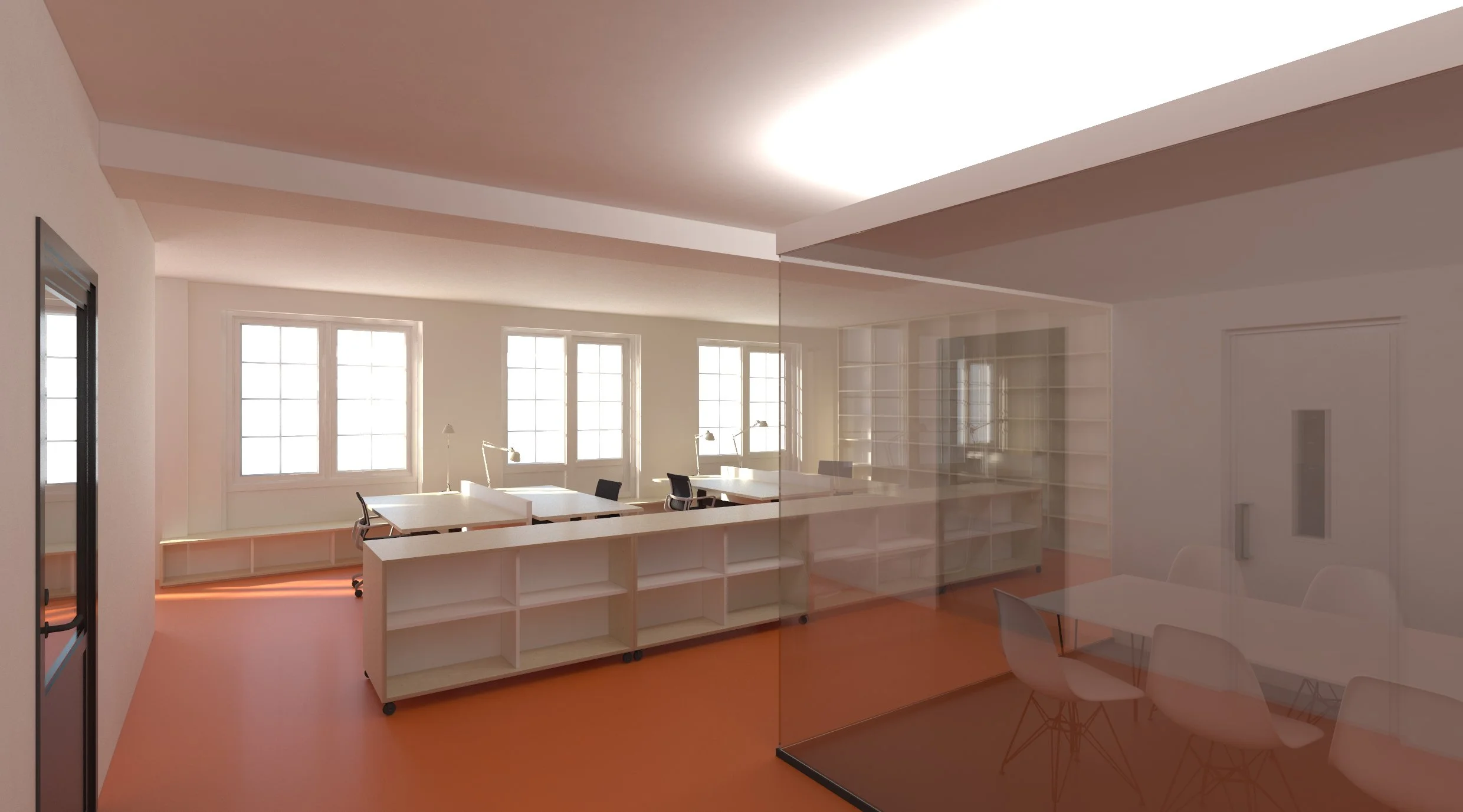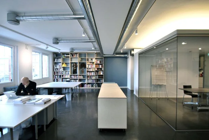 Lokalet ble med forslaget bygget om til et lyst semiåpent kontorlandskap, med en møteromsboks av glass i midten som et sentralt element lokalet orienterer seg rundt.